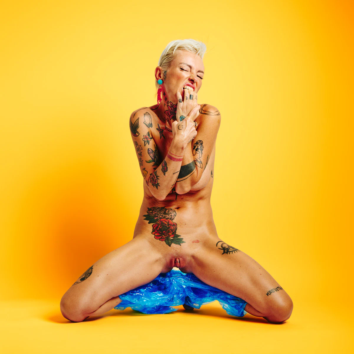 This explicit art nude series showcases Lu Epic's confrontational aesthetic through bold color and transparent materials. Wearing translucent blue plastic pants that reveal while concealing, she poses against saturated colored backgrounds that shift the visual mood throughout the series. Her extensively tattooed body becomes a layered canvas of personal and artistic expression, while her short blonde hair and intense gaze project unwavering confidence. Lu Epic's provocative attitude and expressive body language transform each frame into a statement piece—playful yet defiant, raw yet composed. The combination of glossy plastic textures, vibrant complementary colors, and her unapologetic presence creates contemporary erotic art that challenges and captivates.