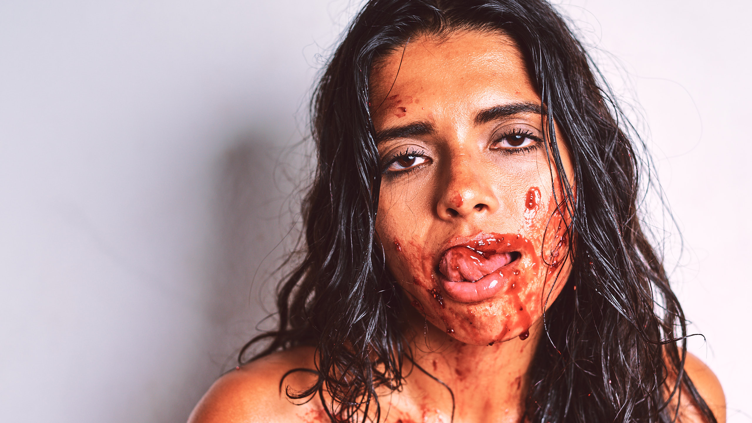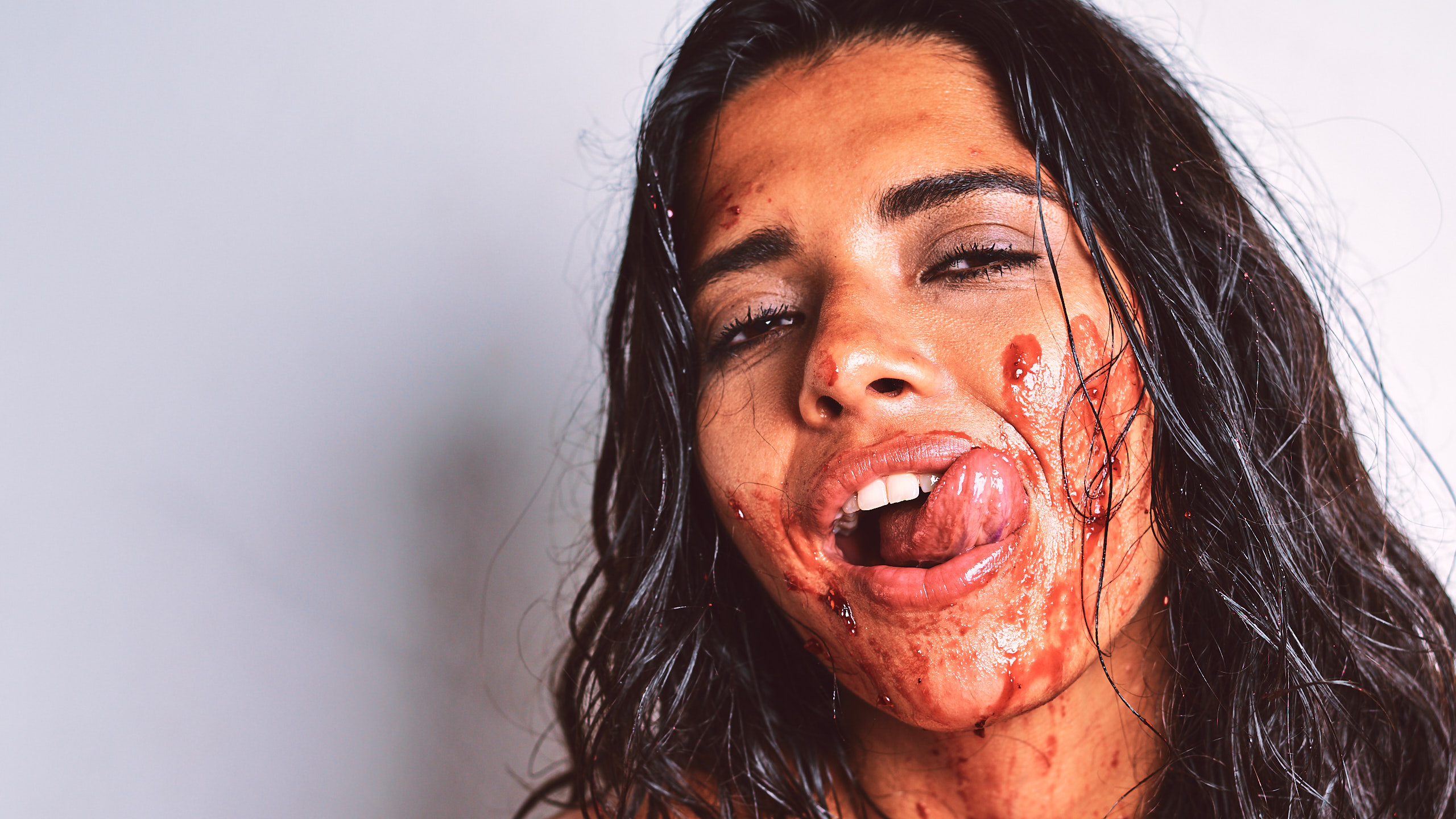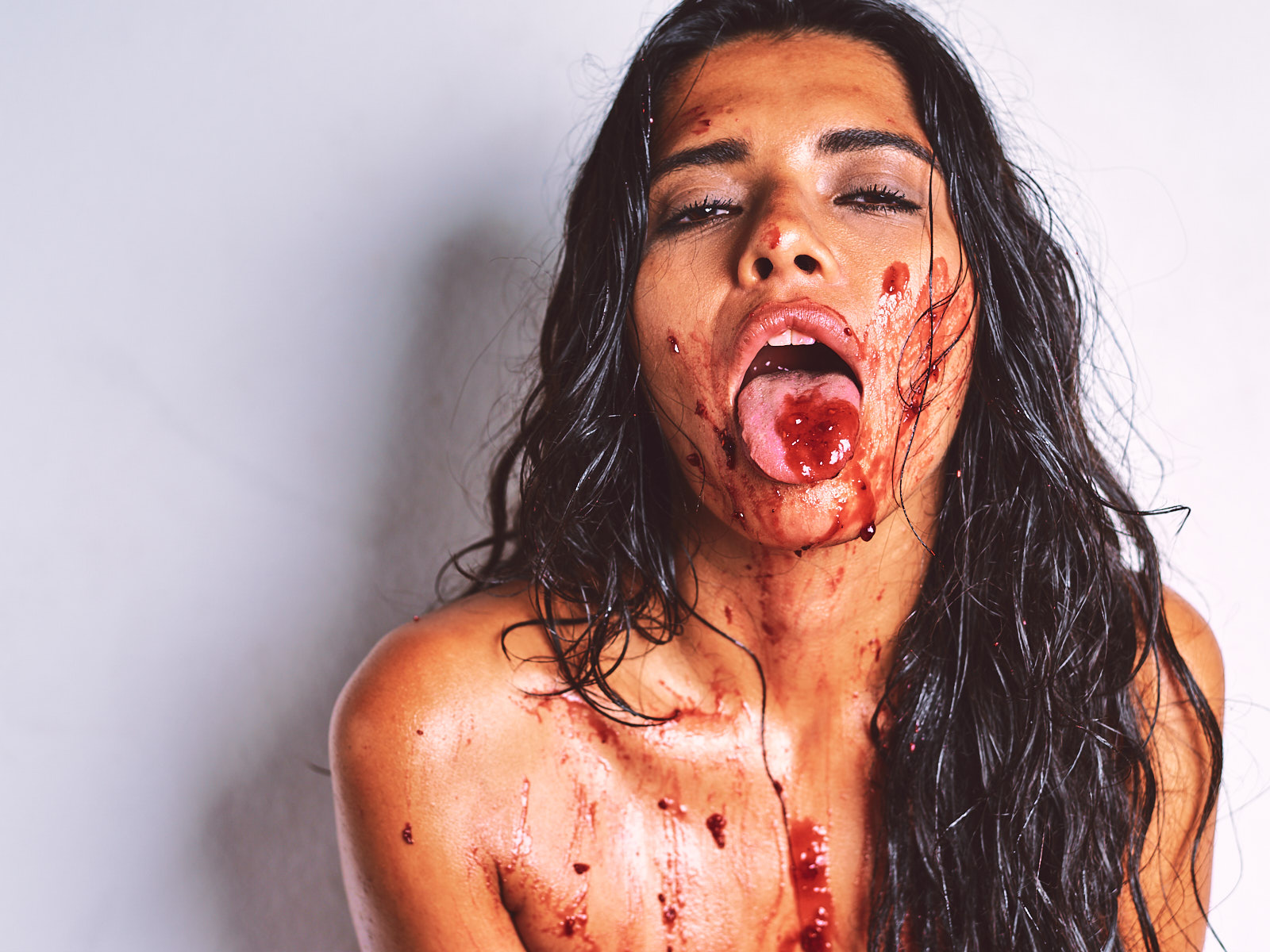 Body Jam presents Sofia in messy nude art photography by Cinaed Dane, celebrating Spanish Guatemalan beauty through full body strawberry jam indulgence, lustful sensual expressions, and intimate desire emphasizing her luring eyes and captivating sensual presence showcasing fearless physical expression. Fully nude, Sofia smears strawberry jam on her body, breasts, torso, and most intimate parts with lust and sensual expressions while her luring eyes command attention through expressive gestures. This series photographed by Cinaed Dane in Barcelona Spain highlights Sofia's lustful tongue licking jam on her lips, captivating luring gaze, and interplay of messy strawberry aesthetics on her sensual nude form celebrating unapologetic desire and intimate body indulgence. The combination of her luring eyes, sensual presence, lustful expressions, and messy body jam creates memorable erotic experience exploring raw sensuality.
